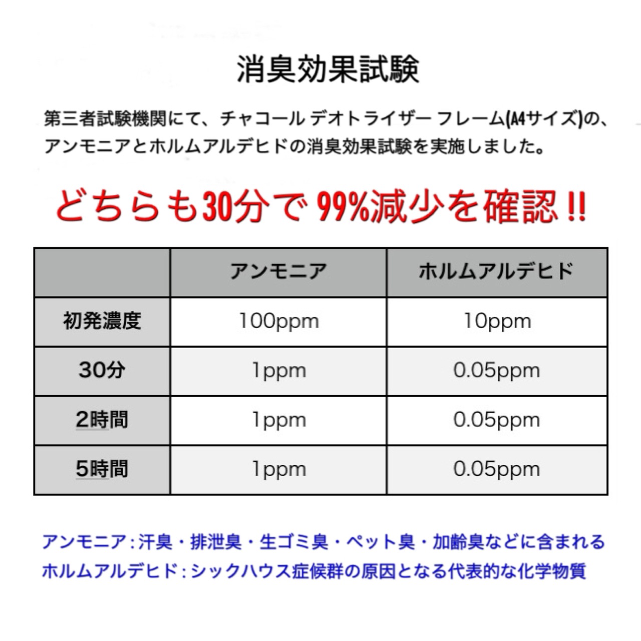 A4サイズの本品と同じ炭材を、第三者機関により消臭効果試験したところ、アンモニアとホルムアルデヒドの消臭99%の結果を出しました。