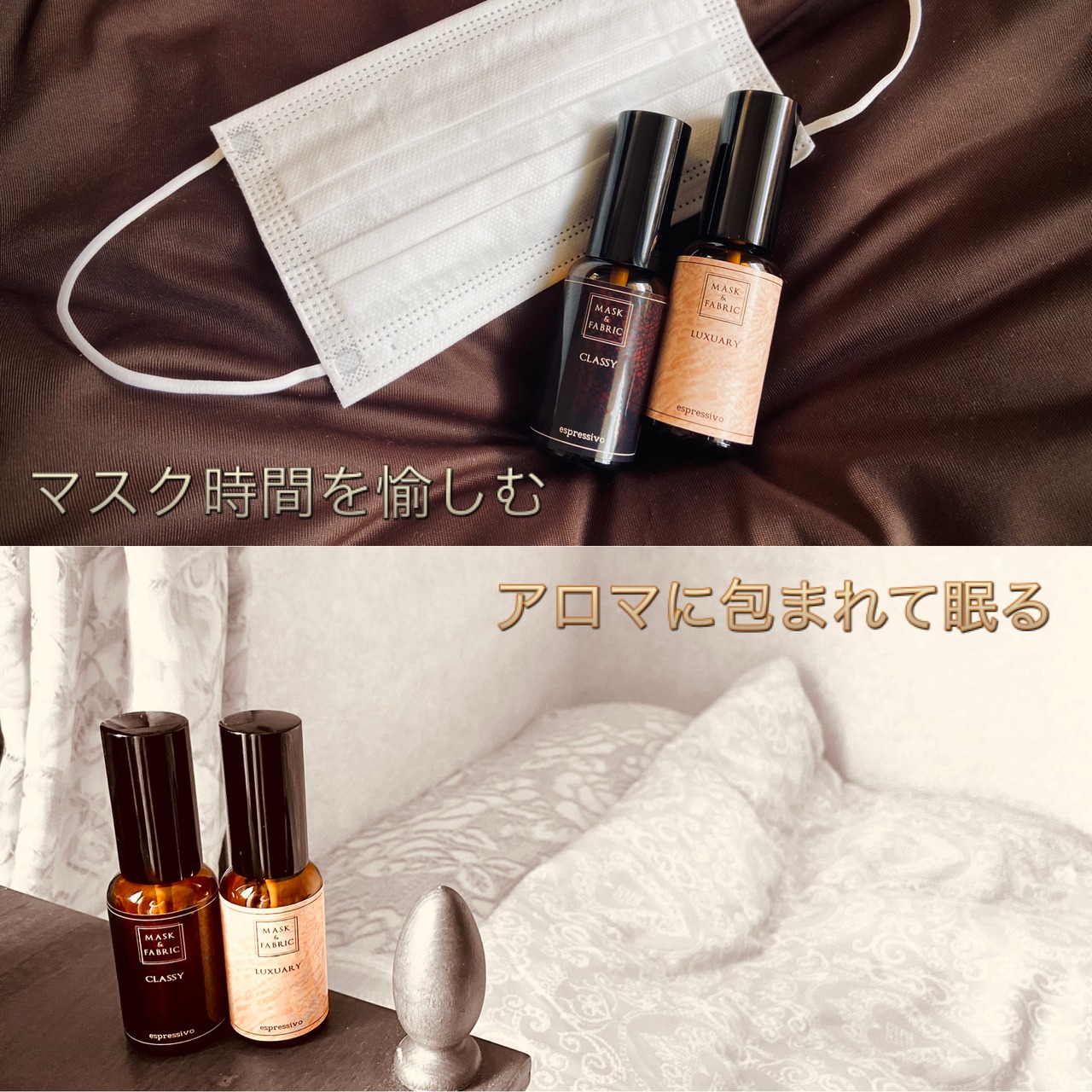 天然のヒノキやゼラニウムなどの香りは、ダニなどの虫を近づけない忌避効果があるといわれています。ラグジュアリー・クラッシー共に、マスクだけでなく、枕やタオルなどに使う「ファブリックスプレー」としてもご利用いただけます。贅沢な香りに包まれるリラックスタイムにもぜひご活用ください。 特に枕に使うのがおすすめです。