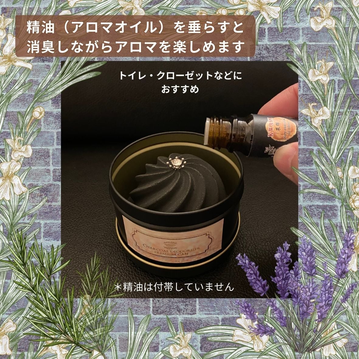 精油を炭部に垂らすと、消臭しながらお好きなアロマを愉しむことができます。臭いを香りで誤魔化しませんので、トイレやクローゼット、玄関などにおすすめです。