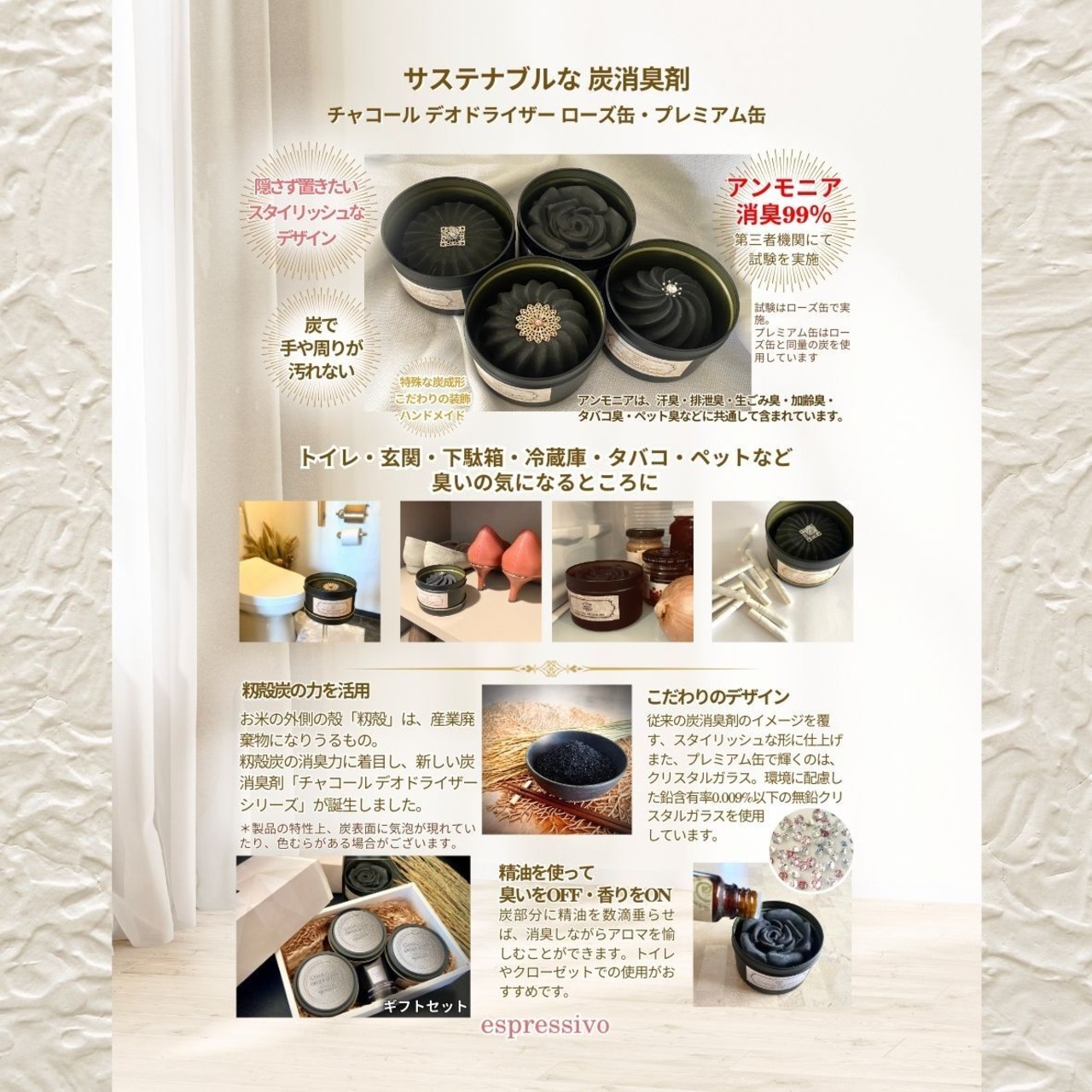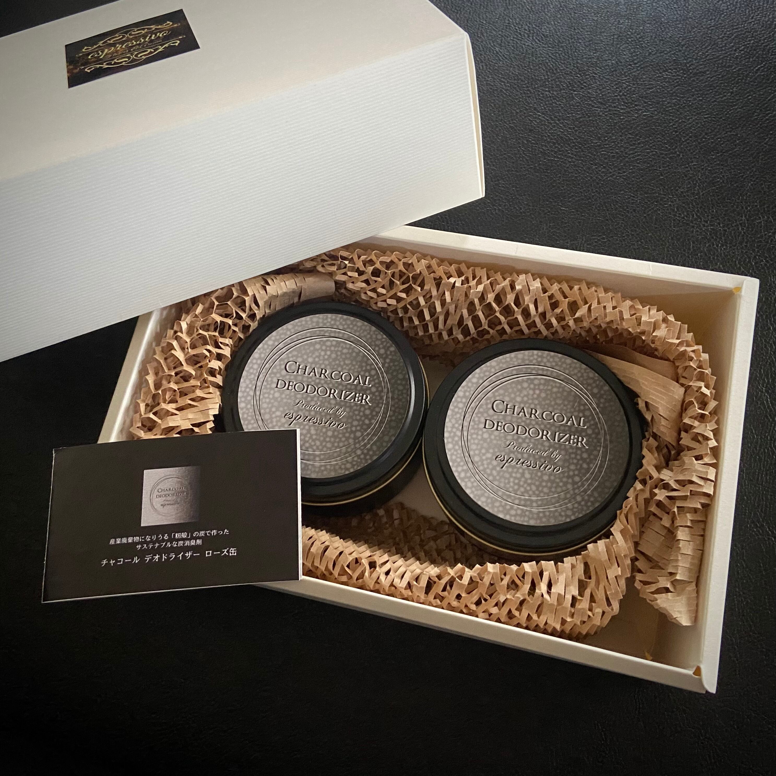 インテリア性にこだわった、アンモニア消臭99%の炭消臭剤「ローズ缶」2個のギフトセットです。