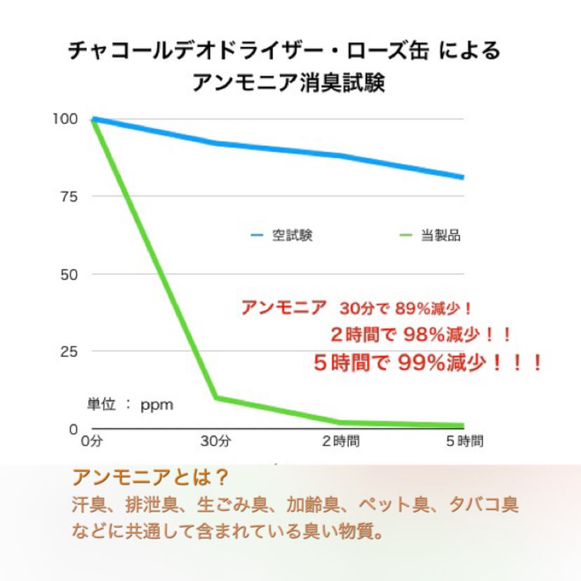 消臭効果試験:30分でアンモニア89%減!5時間で99%減!!