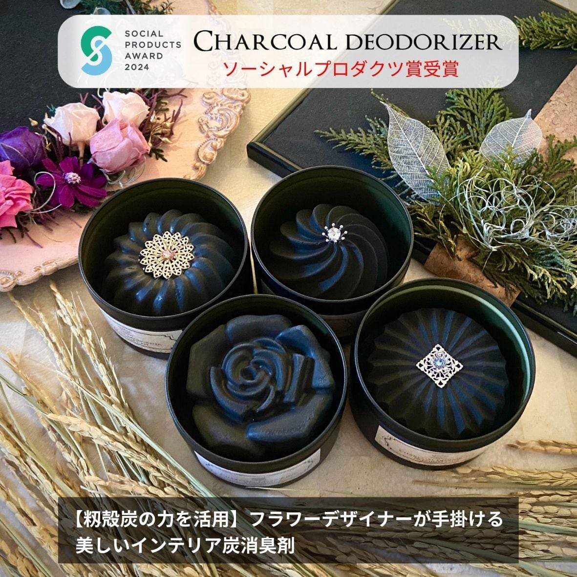 産業廃棄物になるうるお米の外側「籾殻」の炭を使い、特殊な炭成形を施し、ひとつずつ丁寧に作っています。ソーシャルプロダクツ賞を受賞した商品です。