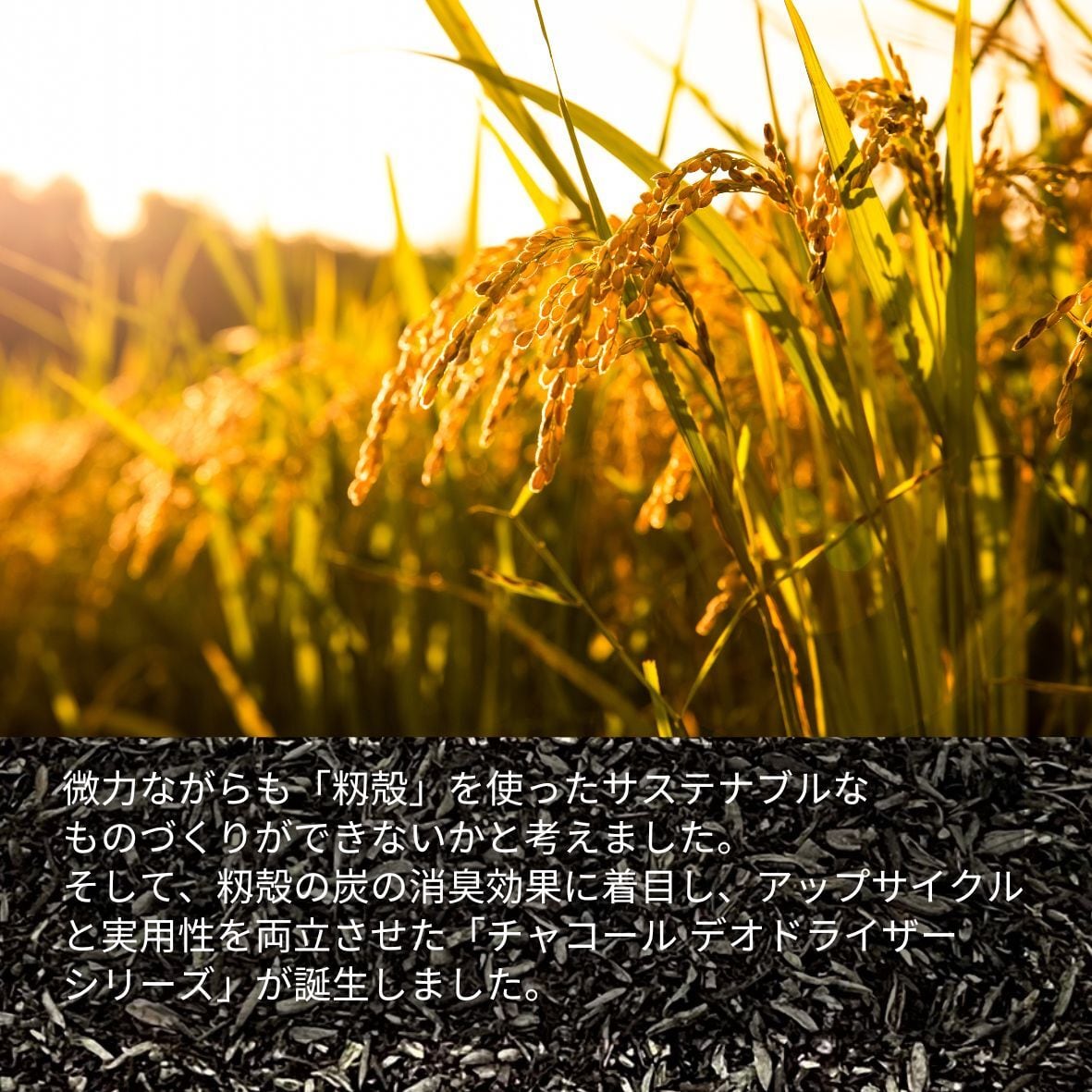この商品は、籾殻(もみがら)を炭化させたものから作られています。籾殻は、精米のときにとれる米の外側についた皮のこと。