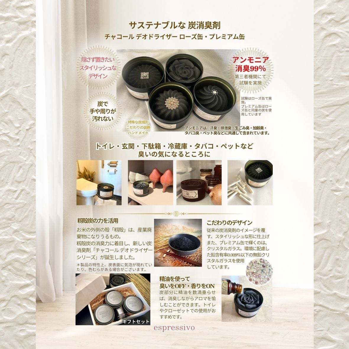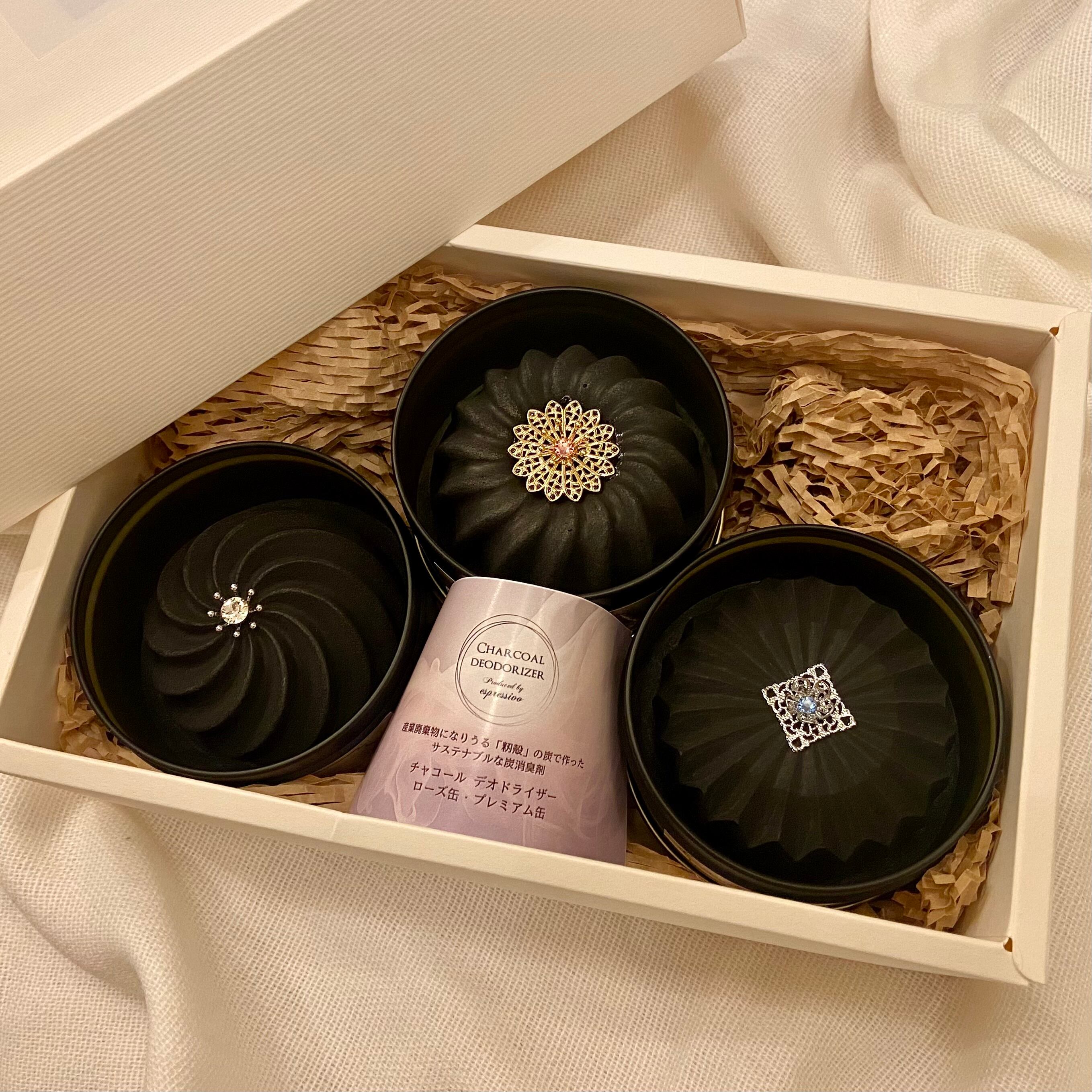 インテリア性にこだわった、アンモニア消臭99%の炭消臭剤「プレミアム缶」3種のギフトセットです。