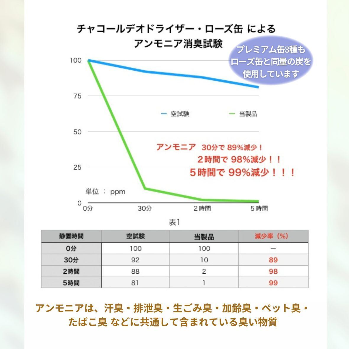 試験は姉妹品の「ローズ缶」で行いましたが、「プレミアム缶」3種それぞれは「ローズ缶」と同量の炭を使用しています。