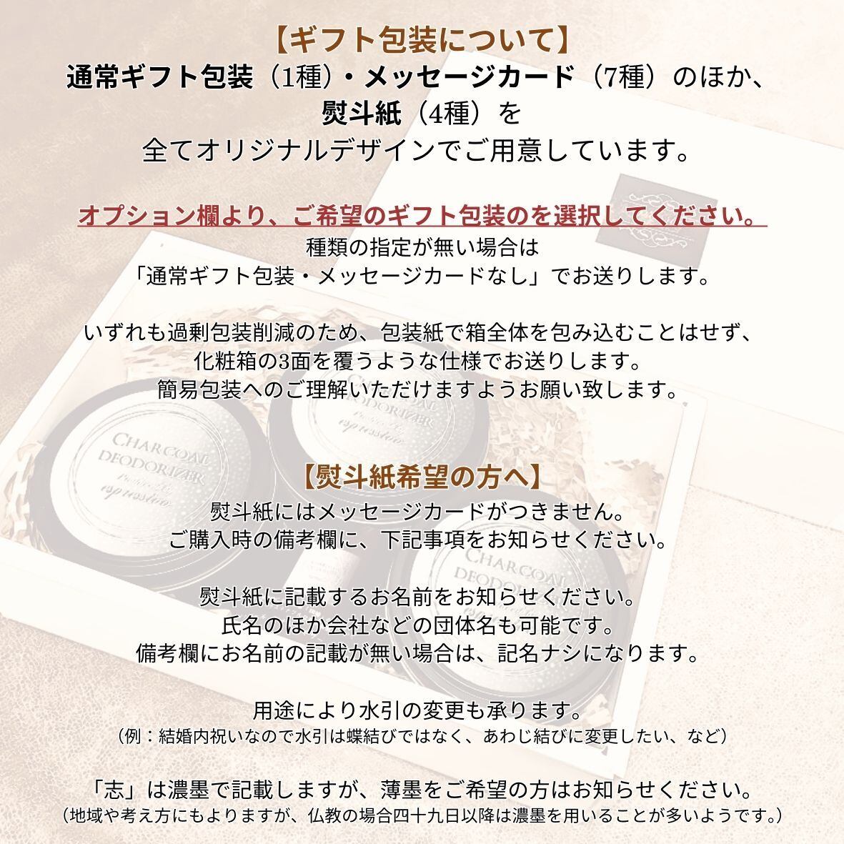 こちらの商品はギフト包装してお届けしますが、過剰包装削減のため、包装紙で全体を包み込むことはせず、化粧箱の3面を覆うような仕様でお送りします。ご理解いただけますようお願い致します。